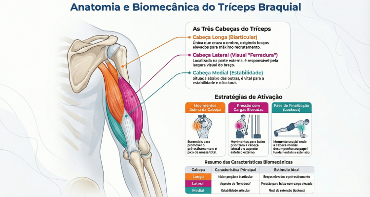 Antes de selecionarmos os melhores movimentos, é crucial entender com o que estamos trabalhando. O tríceps braquial, como o nome sugere, possui três “cabeças” ou origens distintas que se inserem em um tendão comum no olécrano (cotovelo). Apesar de todas trabalharem juntas na extensão do braço, cada uma possui particularidades de ativação.